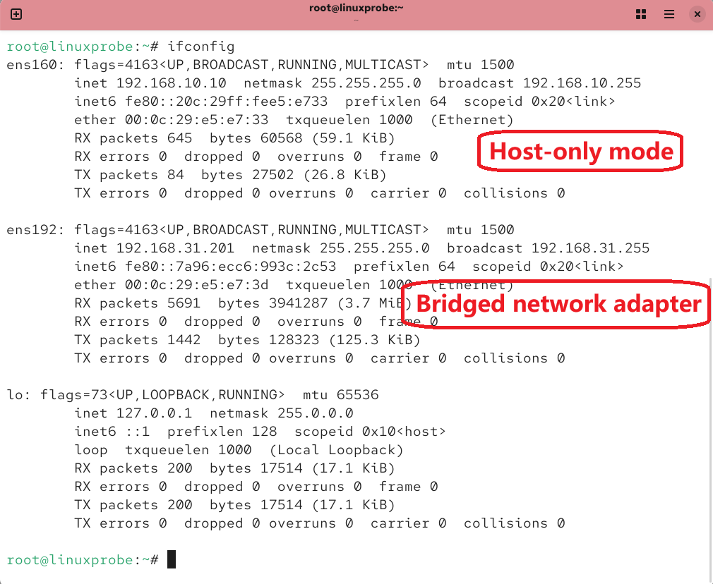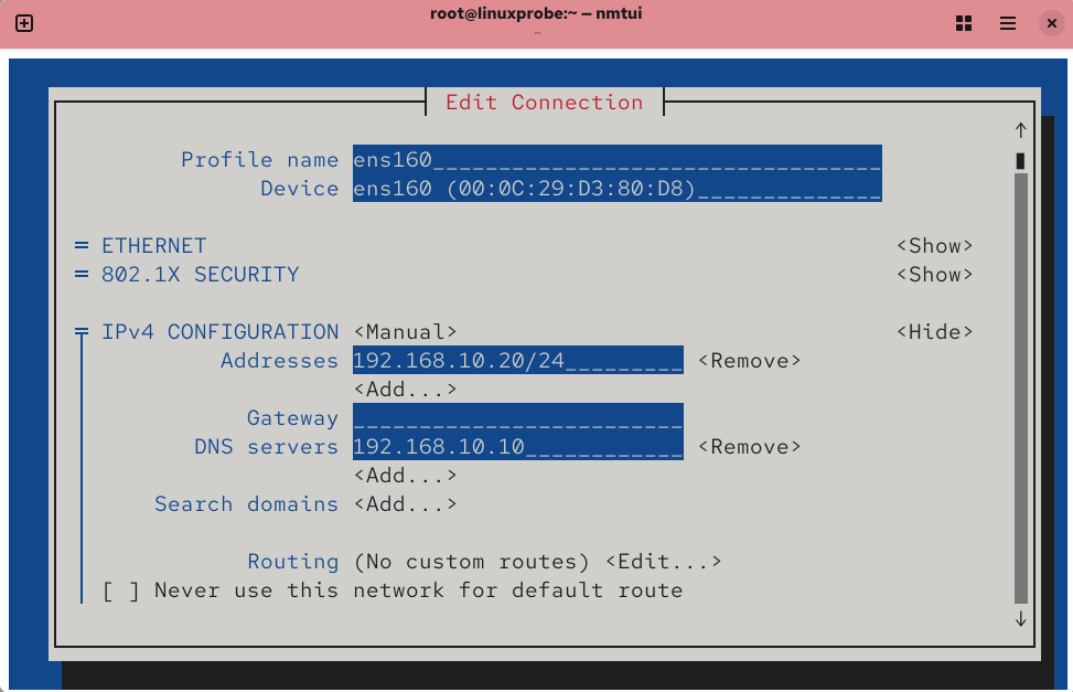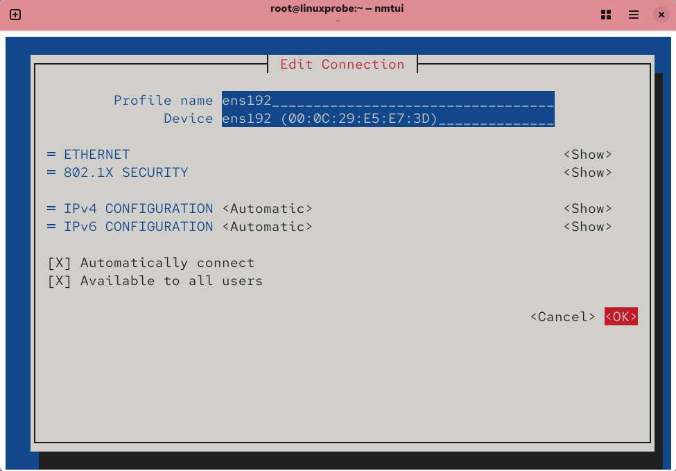 A newly added NIC typically has no config file—enter the name/type yourself. And don’t forget to bring it up:root@linuxprobe:~# nmcli connection up ens192