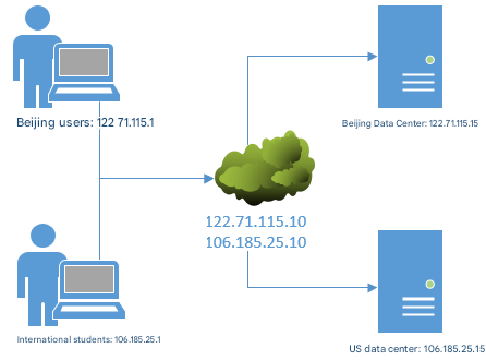 To serve both domestic and overseas readers well, I can deploy multiple servers in different regions and enable split-horizon DNS so readers at the same URL receive the same content from the best-located server. For instance, I assign different public IPs to a DNS server in Beijing and one in the United States (Table 13-6). Readers in China are directed to Beijing; overseas readers are directed to the U.S., as in Figure 13-14.