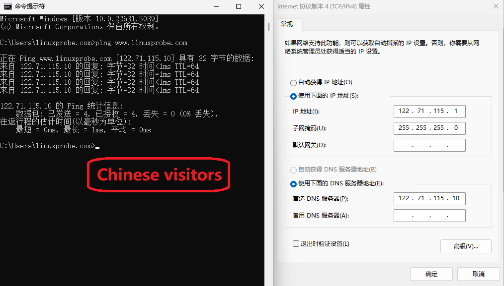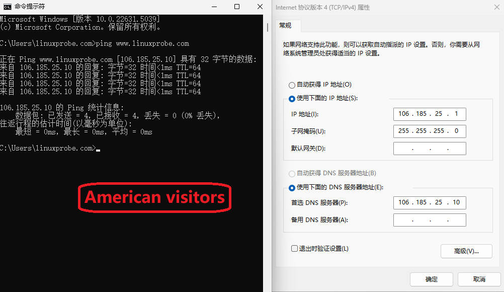 ). With the appropriate IPs in those files, split-horizon DNS is achieved. When a user in China queries linuxprobe.com