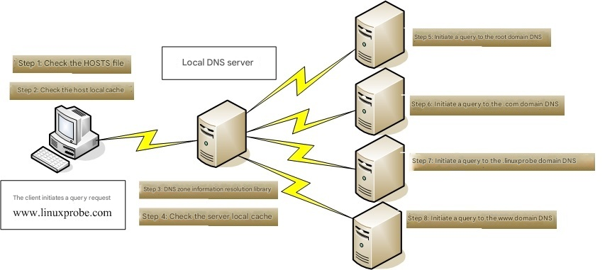 For example, if I query a nearby DNS server for www.linuxprobe.com, the approximate flow looks like Figure 13-2.