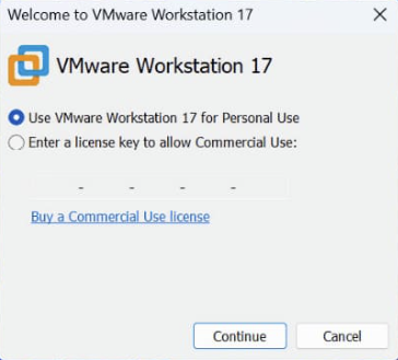 Double‑click the desktop shortcut. In the dialog in Figure 1‑10, choose Use VMware Workstation 17 for personal use and click Continue.
