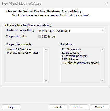 Because this is a fresh install, compatibility is not a concern. Set Hardware compatibility to Workstation 17.5 or later and click Next (Figure 1‑14).