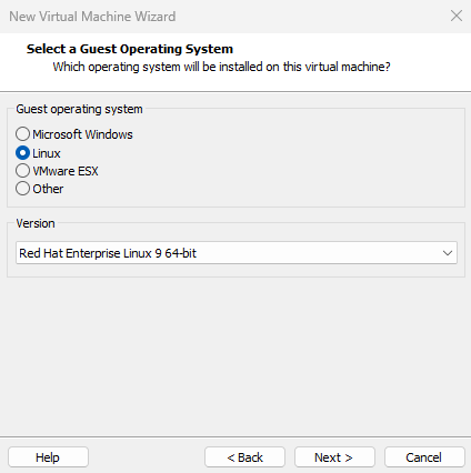 At the time of writing, RHEL 10 had just been released (May 20, 2025), and VMware had not yet added a specific option for it. Choose Linux as the guest OS type and Red Hat Enterprise Linux 9 64‑bit as the version, then click Next (Figure 1‑16). This selection is just a label for the software and will not affect the steps or results in later labs. It mainly helps organize different guests in the VMware console.