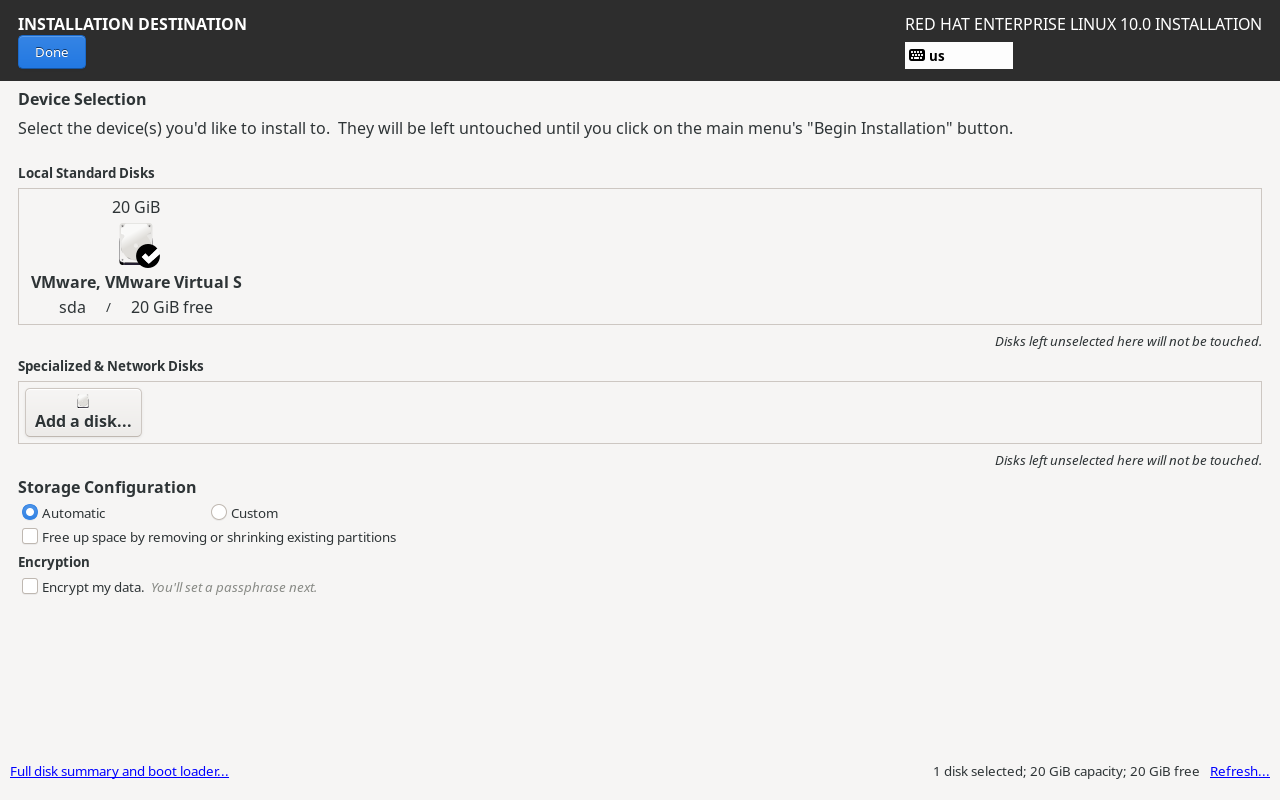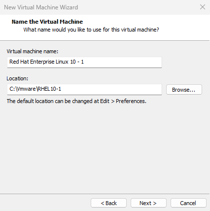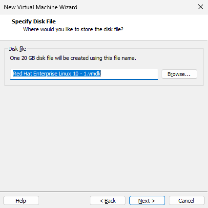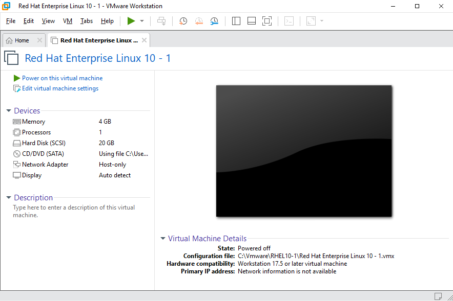 In recent classes, some students insisted on selecting Installer disc image file (ISO) here and pointing at the RHEL 10 ISO. If you do that, VMware will silently deploy a minimal Linux installation using its default strategy and will not prompt you for the configuration choices we need to keep our environment consistent. Please choose I will install the operating system later.