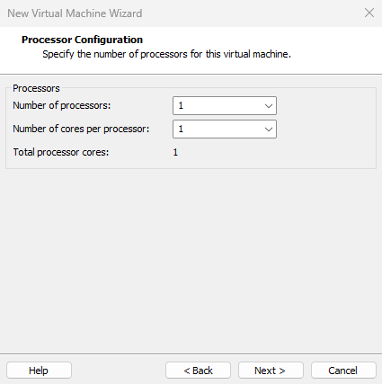 Set Number of processors and Number of cores per processor according to your host CPU. You can look up your CPU model online or open Task Manager in Windows and check the logical processor count on the Performance tab. If in doubt, temporarily set both to 1 (see Figure 1‑18); you can adjust later without affecting the labs. Click Next.
