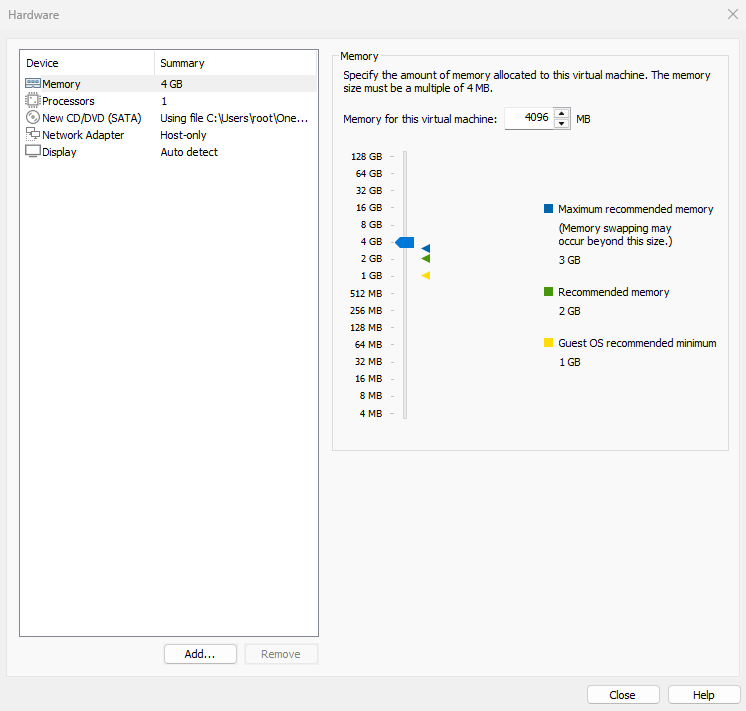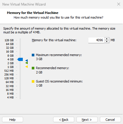 Assign memory to the VM. If your host has less than 8 GB, allocate 2 GB to the VM; if your host has 8 GB or more (16 GB or higher), allocate 4 GB (Figure 1‑19). Allocating much more does not help and may waste memory.