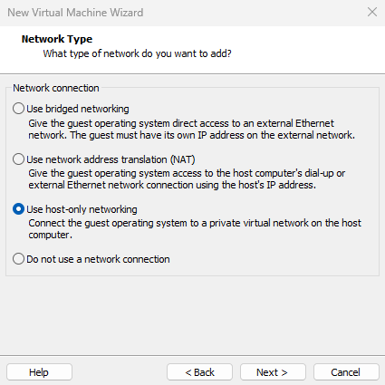 Host‑only: isolates guests from the internet but allows communication with the host; the host‑side adapter is named VMnet1.