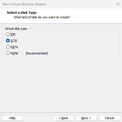 For the virtual disk type, choose SCSI and click Next (Figure 1‑22). Please match the instructor here. If you choose IDE or NVMe, disk names in Chapter 6 will differ from /dev/sda.
