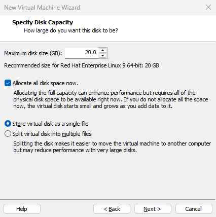 Set Maximum disk size to 20.0 GB (the default). This caps the disk capacity available to the guest; it does not pre‑allocate that space immediately. For better performance, select Allocate all disk space now. If you do not plan to move this VM often, choose Store virtual disk as a single file for slightly better performance. Click Next (Figure 1‑24).
