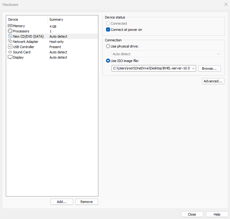 Select New CD/DVD (SATA). On the right, choose Use ISO image file and browse to the RHEL 10 ISO you downloaded (do not unzip it) (Figure 1‑27).