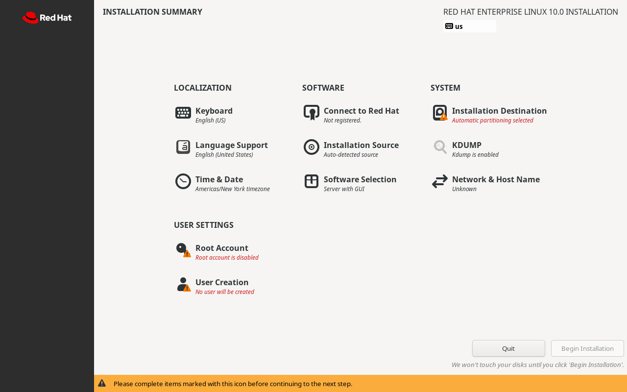 The Installation Summary screen collects all required settings (Figure 1‑34): Keyboard, Language Support, Time & Date, Connect to Red Hat, Installation Source, Software Selection, Installation Destination, KDUMP, Network & Host Name, Root Account, and User Creation.
