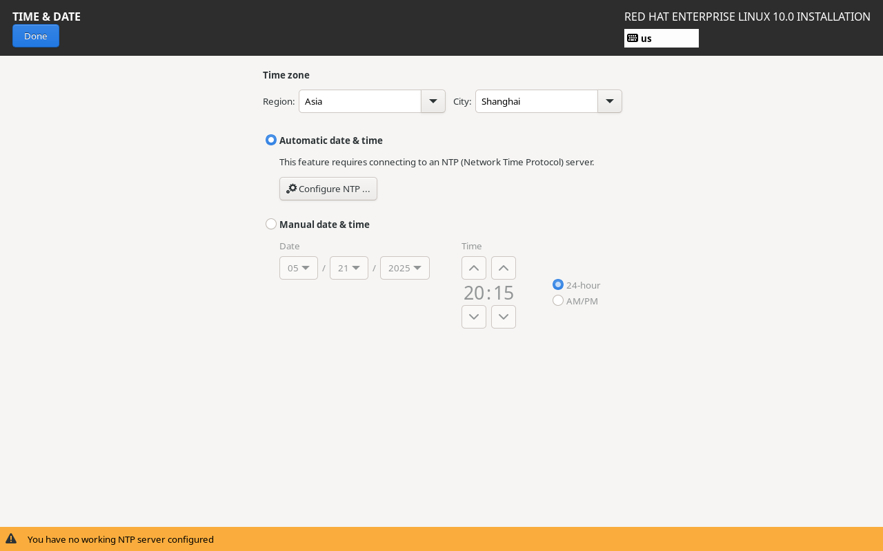 Click Time & Date and set the time zone. Choose Asia as the Region and Shanghai as the City. Click Done (Figure 1‑35).