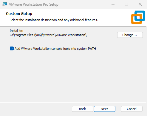 You typically do not need to change the installation path. If free space on drive C: is tight, choose another drive. Select Add VMware Workstation console tools to the system PATH so you can invoke VMware command‑line tools without typing full paths. Click Next (Figure 1‑4).