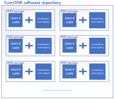 RPM bundles source and install rules to simplify installing a single package. Yum and DNF repositories gather many RPMs and handle dependency resolution automatically, further simplifying installation. -