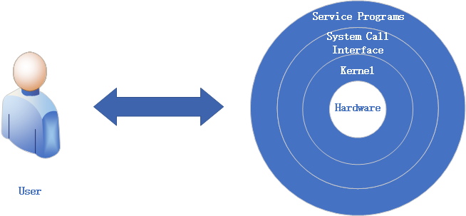 As shown in Figure 2‑1, people cannot operate hardware directly (imagine someone talking to a bare hard disk—it’s absurd). Hardware is managed by the kernel, but the kernel is complex and sensitive, so users should not access it directly. While you could invoke kernel APIs one by one to achieve a goal, even a simple task like “send a message across the internet” may require dozens of system‑call invocations—impractical in day‑to‑day work. Closest to end users are service programs: complete applications that integrate many APIs—for example, WeChat or QQ.
