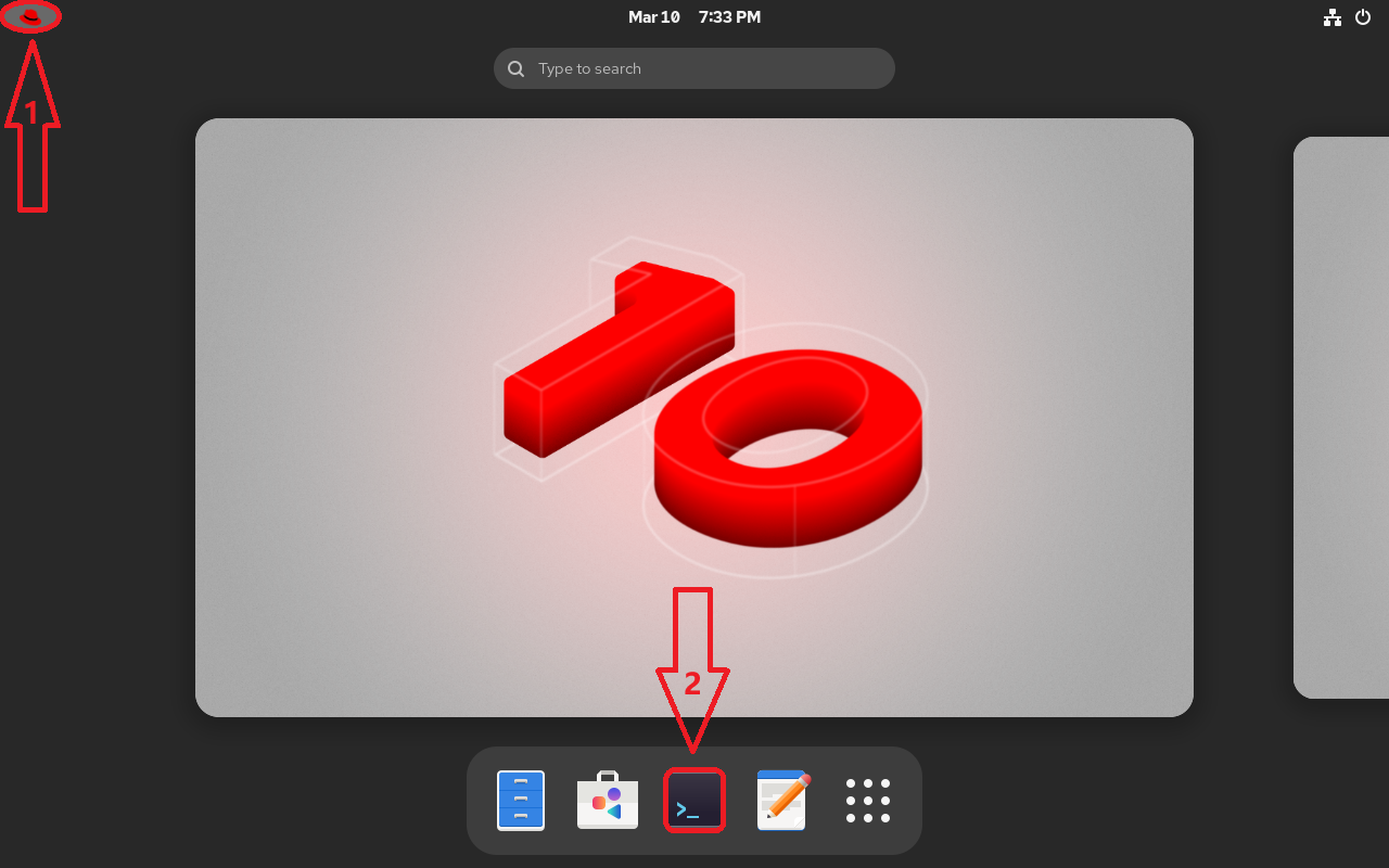 Click the Red Hat icon at top‑left and choose the terminal to open the Bash interpreter (Figure 2‑3).