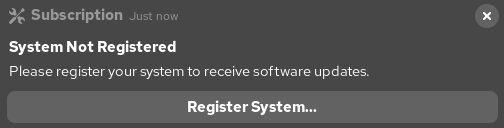 After logging in, if you see a prompt to register, click the × in the upper‑right to close it. Unless you want a paid Red Hat subscription for the latest software and vendor support, you can ignore it. Later we’ll build local repositories so all labs run smoothly.