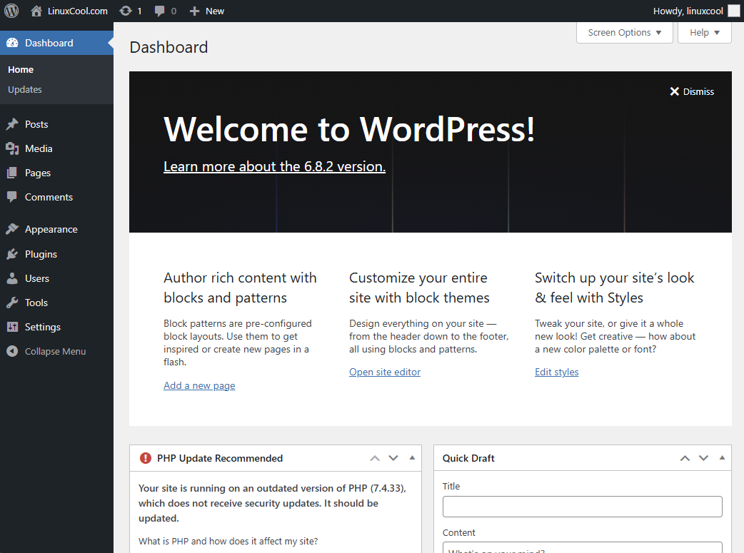 Log in with the credentials you just set (Figure 20‑9) to reach the admin dashboard (Figure 20‑10). Explore and see what kinds of sites you can build with the most popular CMS on the web.
