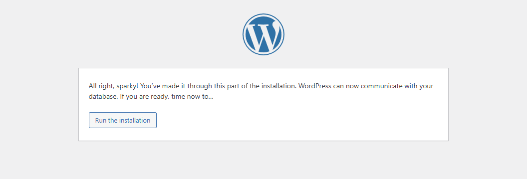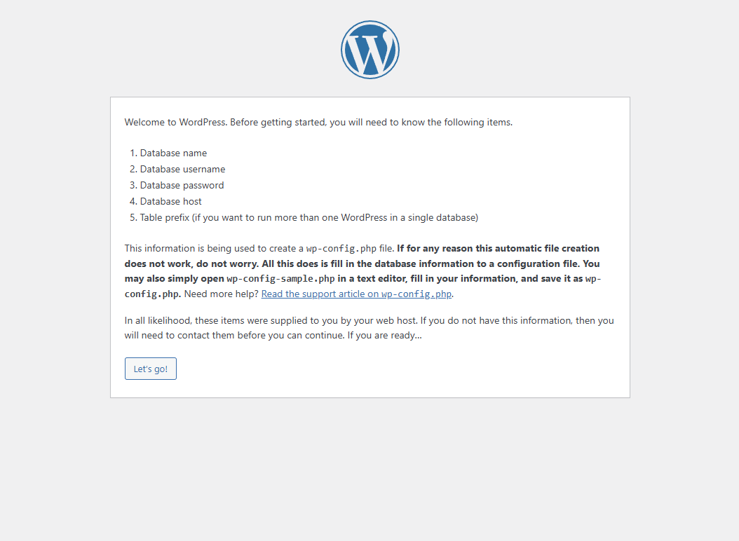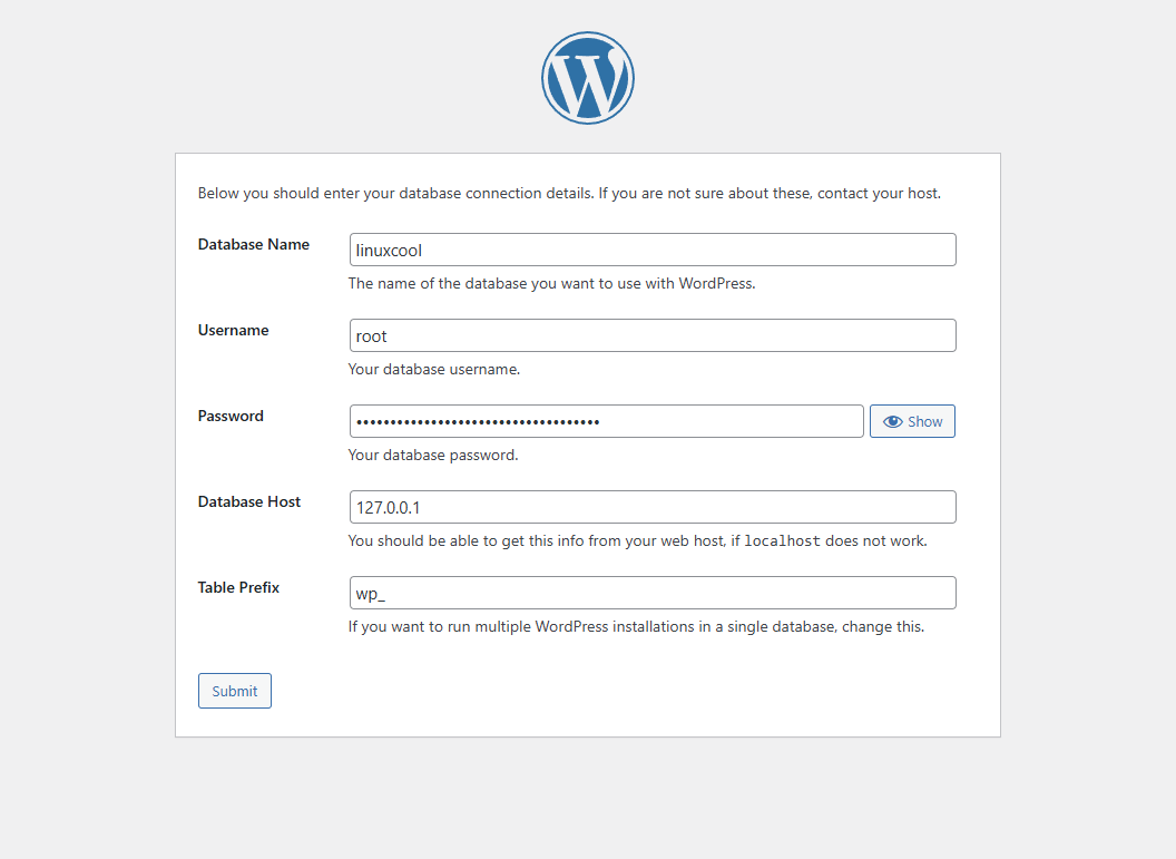 Click “Let’s go!” and enter the database name you created, the username, and the new password. Use 127.0.0.1 for the database host rather than localhost (Figure 20‑5). Click Submit to confirm, then run the installation (Figure 20‑6).