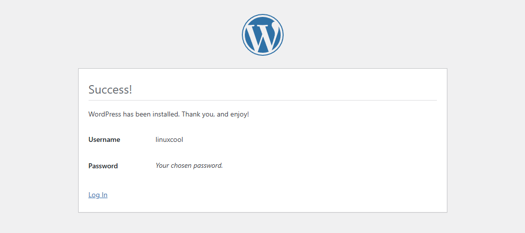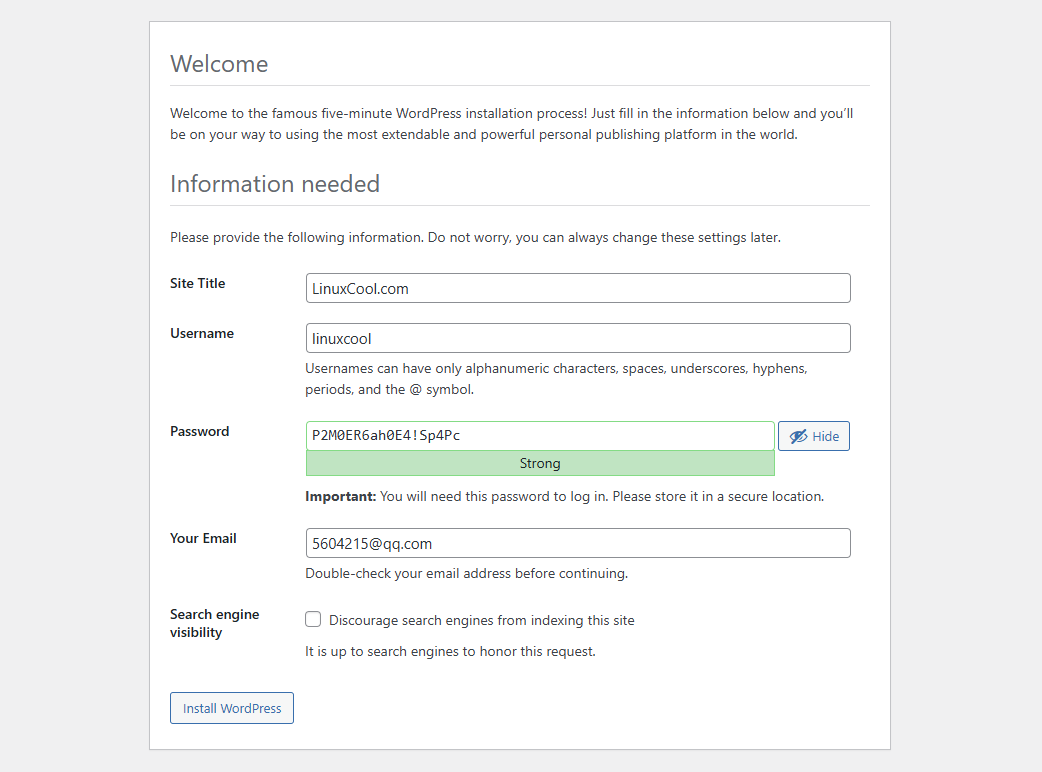 After installation, set the site title, admin username, and password (Figure 20‑7), then click Install WordPress. A success screen appears (Figure 20‑8).