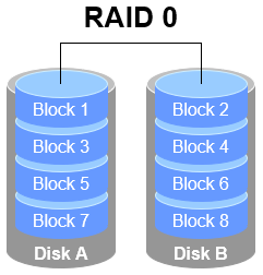 RAID 0 stripes data across at least two physical disks, combining them (via hardware or software) into a single large volume and writing data sequentially across the members. In ideal conditions this multiplies throughput, but failure of any one disk corrupts the entire array. In plain terms, RAID 0 boosts throughput but provides no redundancy or error correction. As shown in Figure 7â1, data is split and written across disks A and B, improving both read and write speeds.