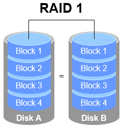 In Figure 7â2, RAID 1 binds two or more disks and writes identical data to each (you can think of it as mirroring). If one disk fails, the system automatically continues operating using the surviving mirror copy.