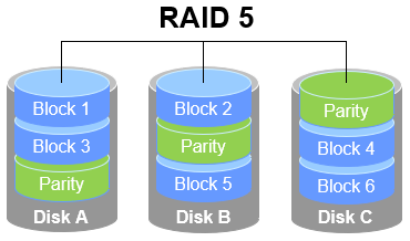 RAID 5 requires at least three disks and uses disk striping. Compared with RAID 1, it stores parity rather than complete replicas, so repeated writes to a file need only update the associated parity, improving efficiency and reducing storage cost.