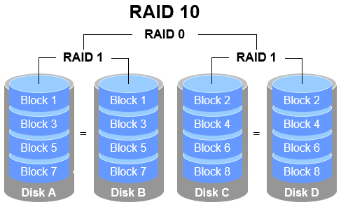 10 | 4 | n/2 | n/2 | High | Combines RAID 1 and RAID 0 to deliver both performance and safety; tolerates up to half the disks failing (so long as failures are not within the same mirror pair) without data loss |