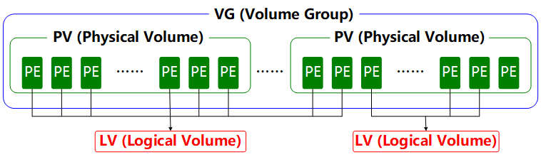 Which is at the very bottom layer of LVM: the physical volume or the volume group?