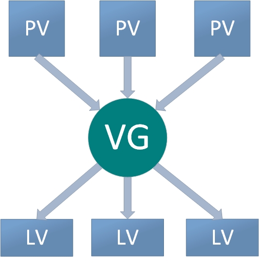A: The physical volume is at the bottom; volume groups are built from PVs. -
