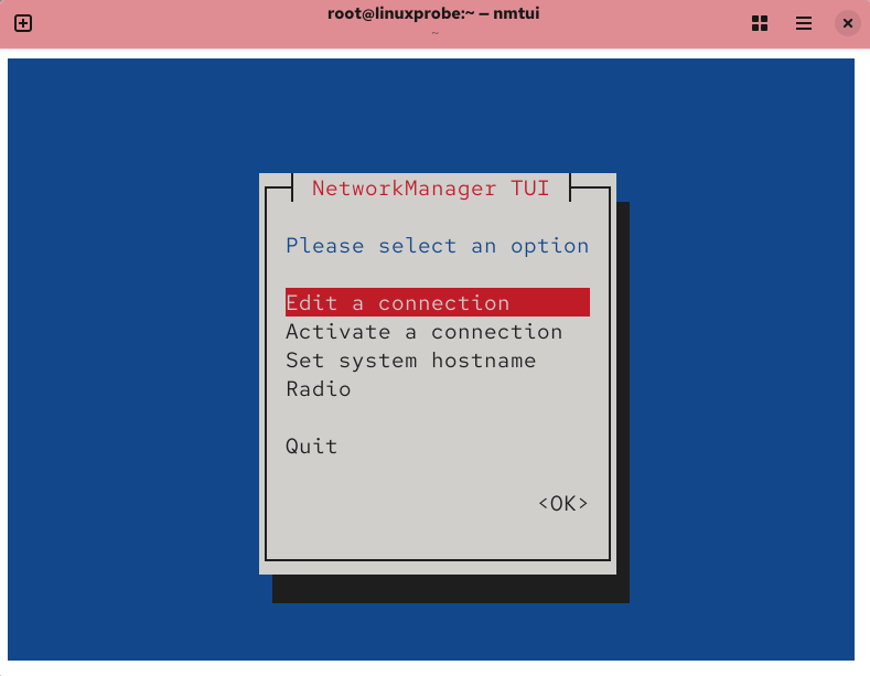 Section 4.1.3 showed how to edit interface files with Vim. On RHEL 10 there are at least five ways to configure networking; I try to demonstrate them all in this book. Here I’ll use nmtui to configure networking, following Figures 9‑1 through 9‑8. I add extra notes where something isn’t immediately obvious.