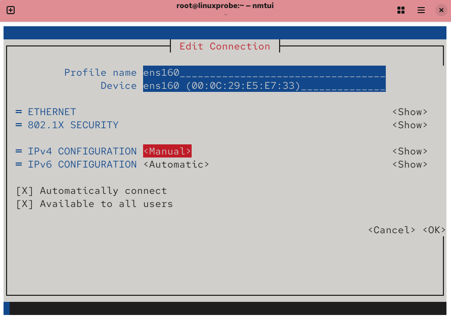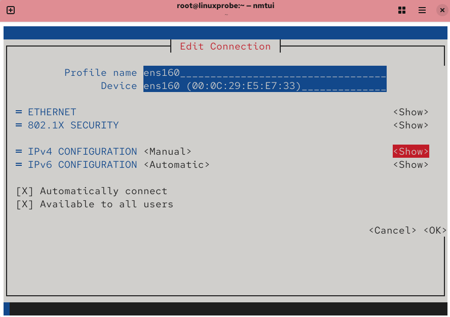 root@linuxprobe:~# cat /etc/NetworkManager/system-connections/ens160.nmconnection
