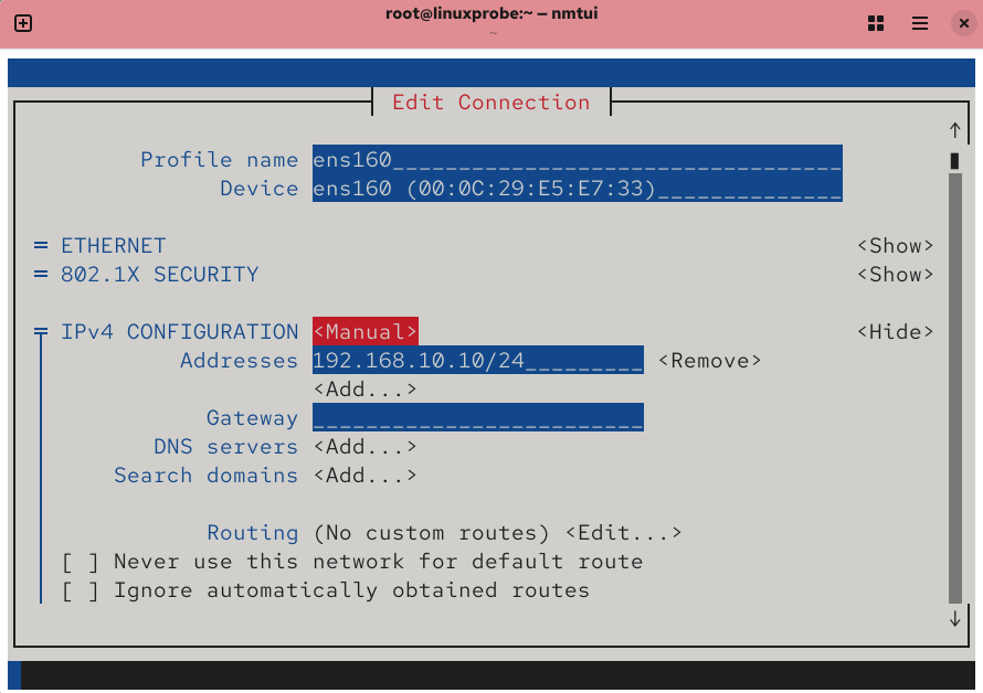 root@linuxprobe:~# nmcli connection add con-name company ifname ens160 autoconnect no type ethernet ip4 192.168.10.88/24 gw4 192.168.10.1
