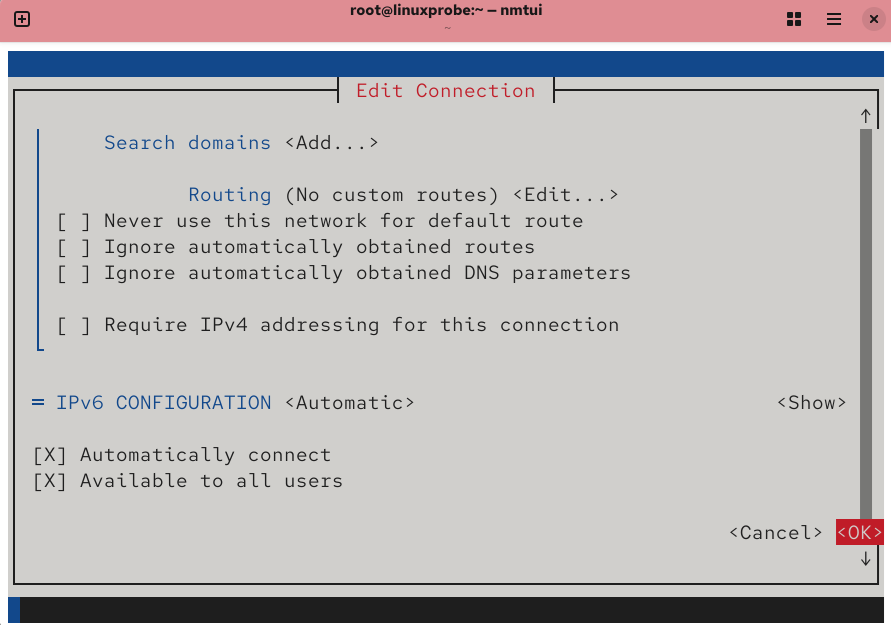 In this chapter, I first use nmtui to configure network parameters and nmcli to inspect network details and manage connection profiles so I can switch settings quickly in different environments. I also demonstrate how to bind two NICs in round‑robin mode to gain load balancing.