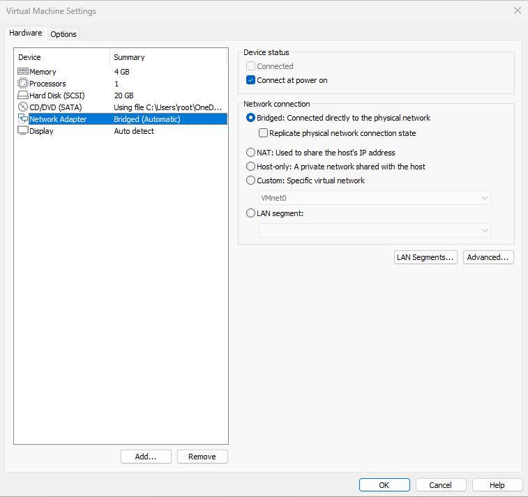 If you use a VM, set the adapter to bridged mode (Figure 9‑9), then reboot the VM.